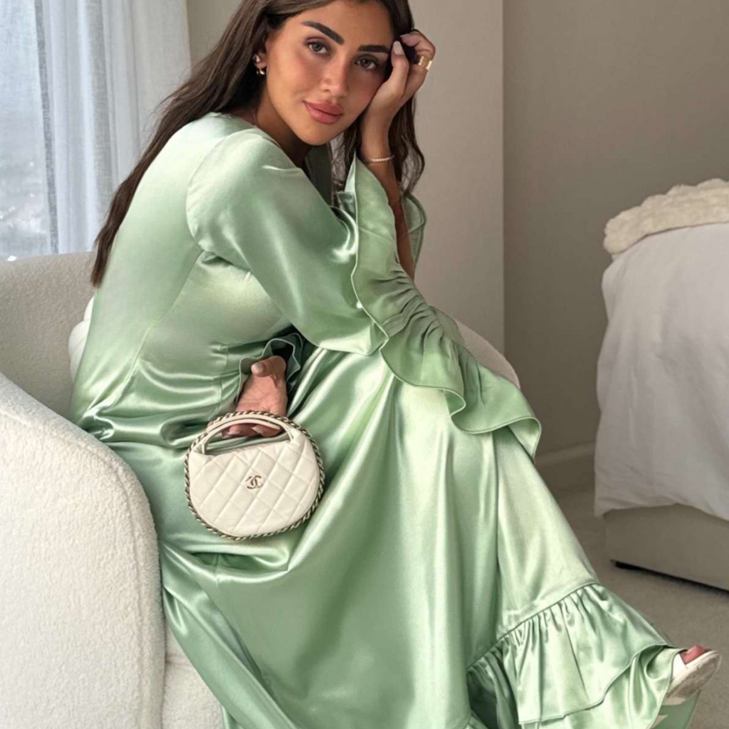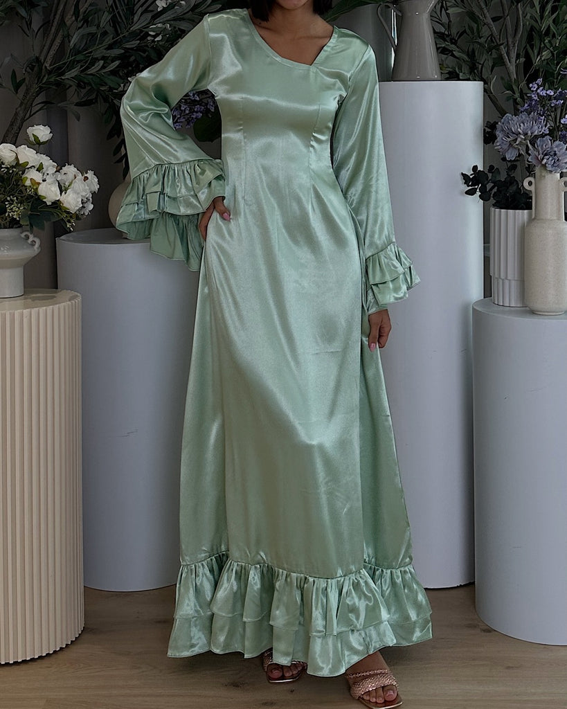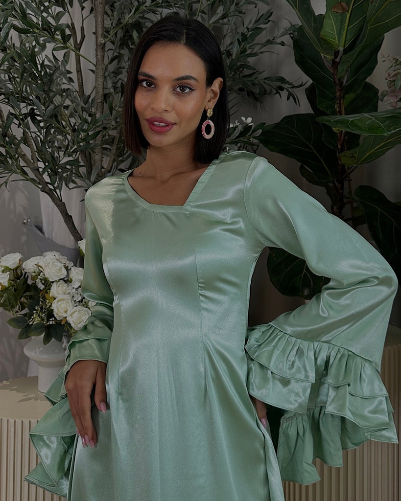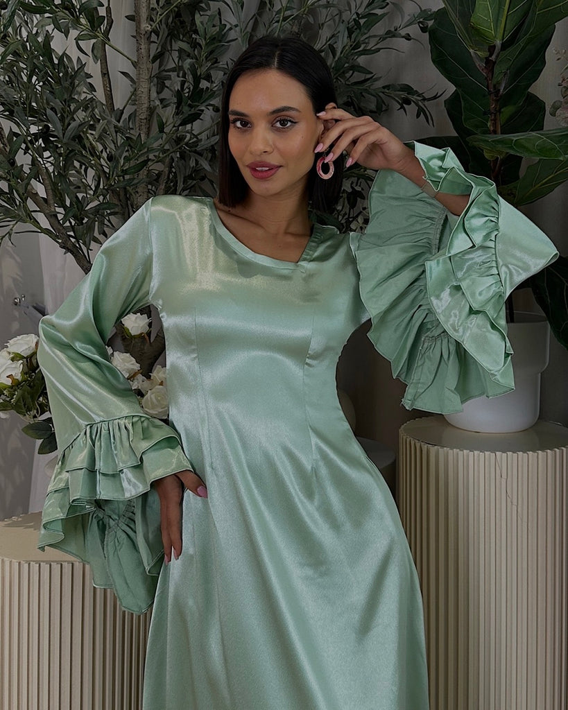 Aya Dress —the epitome of modest sophistication. With a simple A line cut and asymmetrical neckline, this dress features delicate ruffles on the sleeves and hem, combining style and modesty for the contemporary woman in both formal and casual occasions.