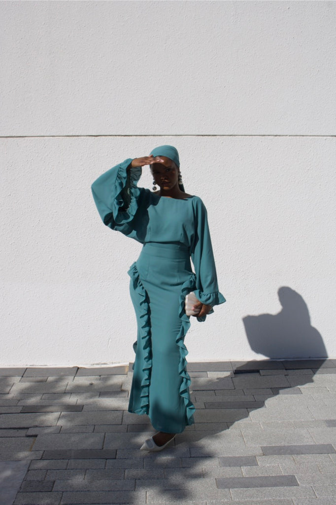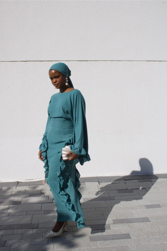 Introducing the Amber Dress —an adaptation of our signature silhouette. A perfect blend of timeless elegance and modern style with a refined bateau neckline, asymmetrical kimono sleeve, and delicate ruffles along the sleeve hem and skirt panels. Amber brings a touch of graceful movement while creating a soft silhouette that accentuates the figure and presents a feminine charm. Offering sophistication for any occasion.